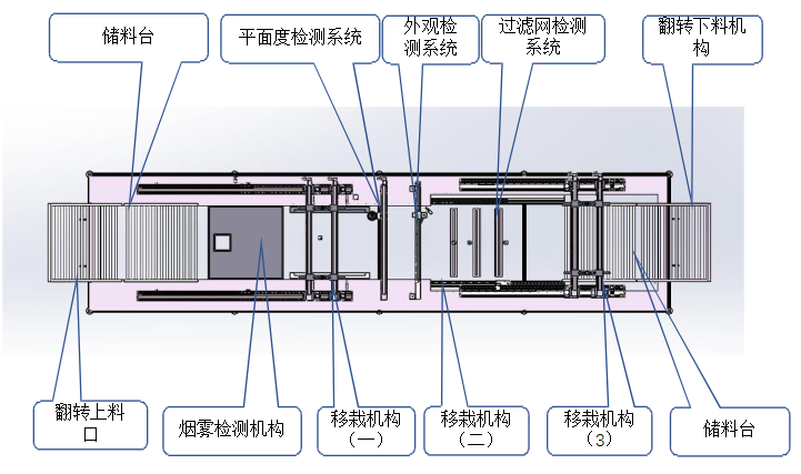 移栽機(jī)構(gòu)(二):采用模組根據(jù)產(chǎn)品調(diào)節(jié)寬距,利用模組將產(chǎn)品移動平面、四周瑕疵、過濾網(wǎng)瑕疵工位檢測。